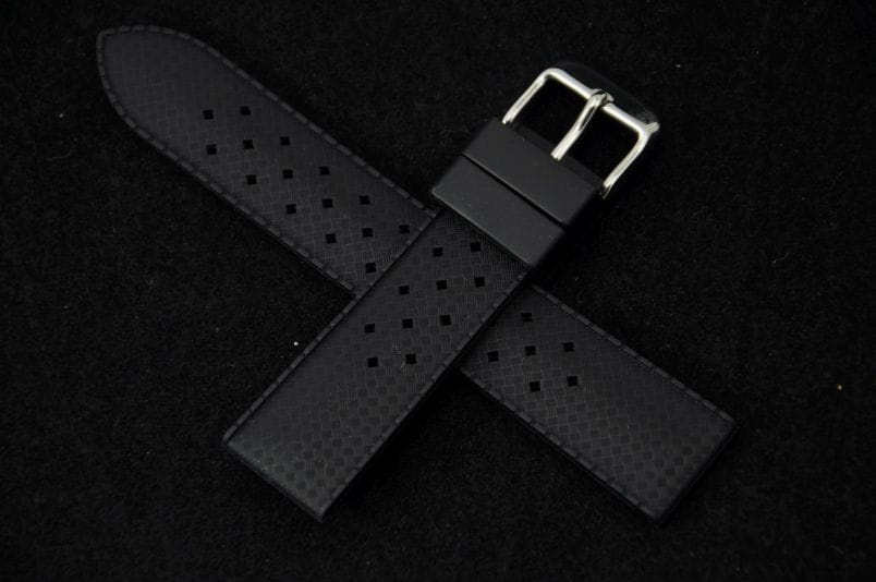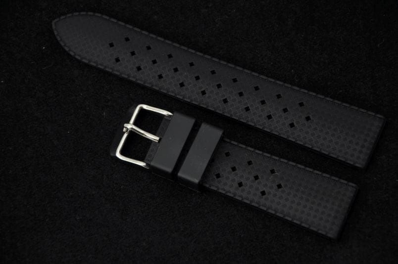 Silikonowy pasek typu Tropic. Charakterystyczne drobne dziurki, delikatny wzór na wierzchu. Lekko pogrubiany do 4mm. Dwie szlufki. Stalowa klamerka.