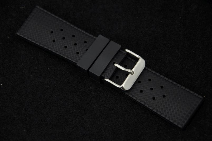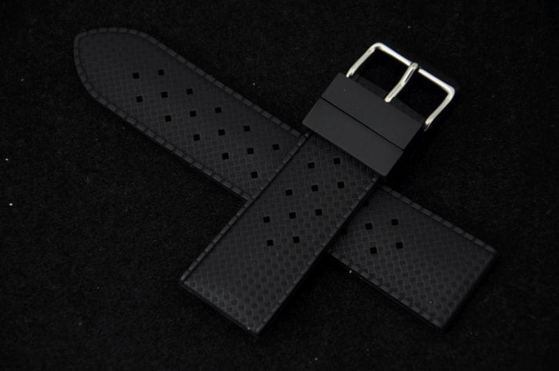 Silikonowy pasek typu Tropic. Charakterystyczne drobne dziurki, delikatny wzór na wierzchu. Lekko pogrubiany do 4mm. Dwie szlufki. Stalowa klamerka.