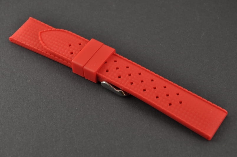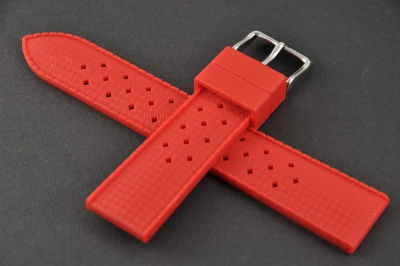 Silikonowy pasek typu Tropic. Charakterystyczne drobne dziurki, delikatny wzór na wierzchu. Lekko pogrubiany do 4mm. Dwie szlufki. Stalowa klamerka.