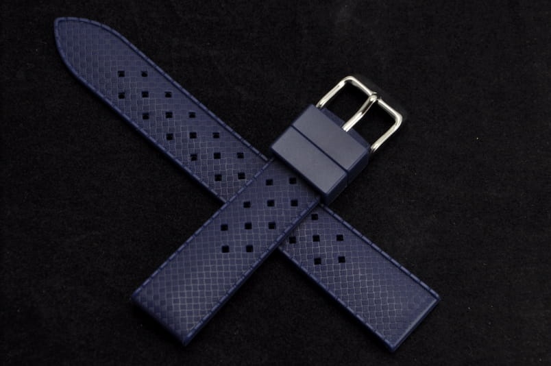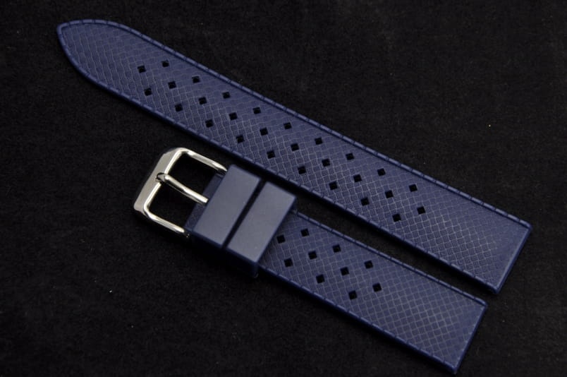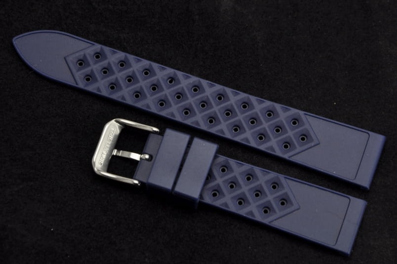 Silikonowy pasek typu Tropic. Charakterystyczne drobne dziurki, delikatny wzór na wierzchu. Lekko pogrubiany do 4mm. Dwie szlufki. Stalowa klamerka.
