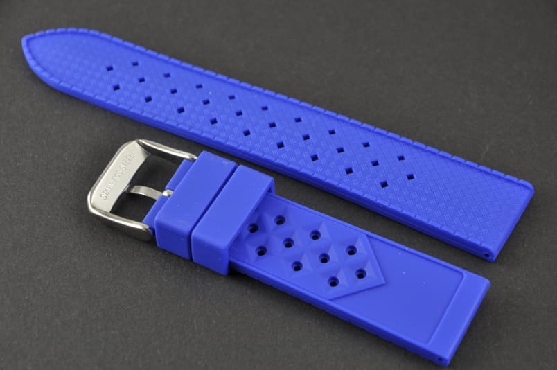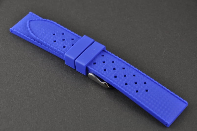 Silikonowy pasek typu Tropic. Charakterystyczne drobne dziurki, delikatny wzór na wierzchu. Lekko pogrubiany do 4mm. Dwie szlufki. Stalowa klamerka.