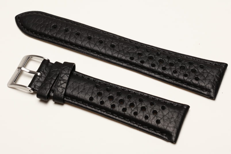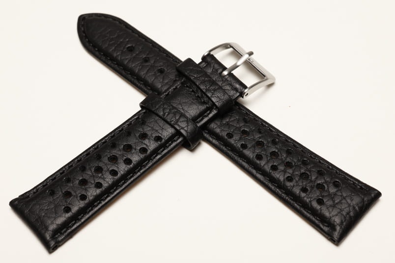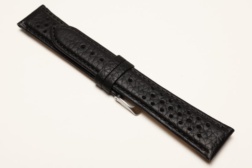 Skórzany pasek typu Tropic z delikatnym wzorem skóry byka. Charakterystyczne drobne otwory. Przeszyty czarną nicią. Płasko pogrubiany do 3,5mm, wyjątkowo miękki . Dwie szlufki. Stalowa, satynowa klamerka. Pasuje do sportowych zegarków vintage np. z lat siedemdziesiątych.