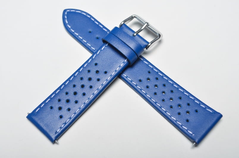 Skórzany pasek typu Tropic. Charakterystyczne drobne dziurki. Przeszyty białą nicią. Płasko pogrubiany do 3mm. Czarna licowa futrówka. Dwie szlufki. Stalowa klamerka. W komplecie teleskopy.