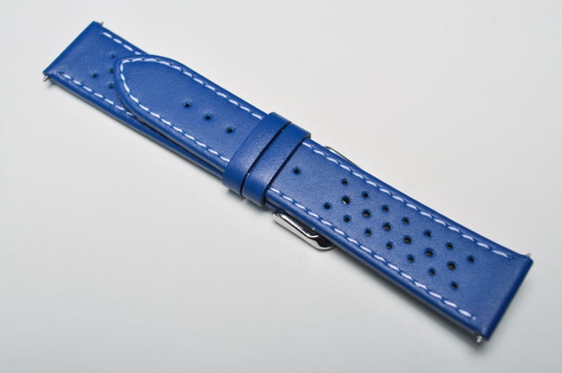 Skórzany pasek typu Tropic. Charakterystyczne drobne dziurki. Przeszyty białą nicią. Płasko pogrubiany do 3mm. Czarna licowa futrówka. Dwie szlufki. Stalowa klamerka. W komplecie teleskopy.