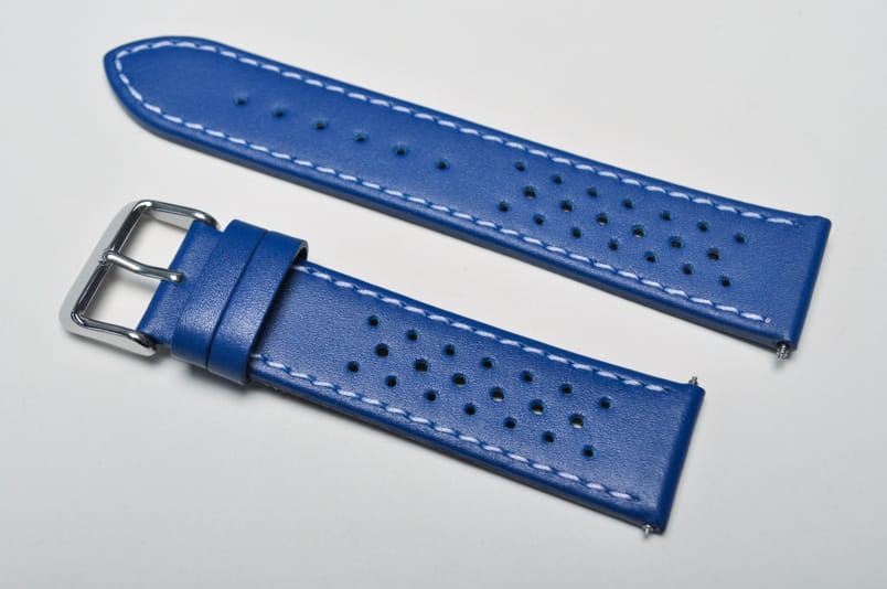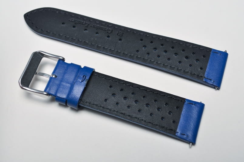 Skórzany pasek typu Tropic. Charakterystyczne drobne dziurki. Przeszyty białą nicią. Płasko pogrubiany do 3mm. Czarna licowa futrówka. Dwie szlufki. Stalowa klamerka. W komplecie teleskopy.