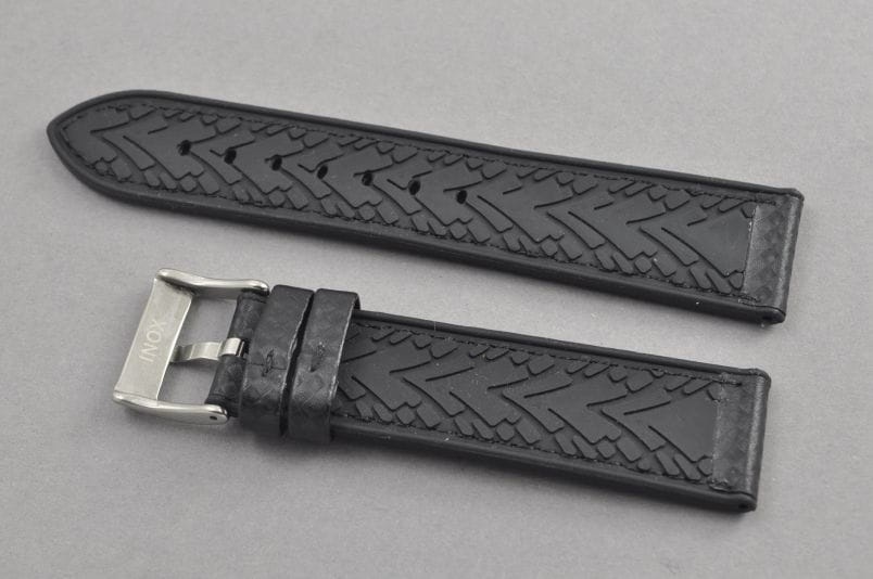 Pasek o typowo sportowym charakterze. Wykonany z naturalnej skóry tłoczonej we wzór karbonu,miękki i elastyczny. Przeszywany nicią w kolorze silikonu na spodzie. grubość 4mm.Podwójna szlufka, stalowa klamerka o szerokości 18mm.