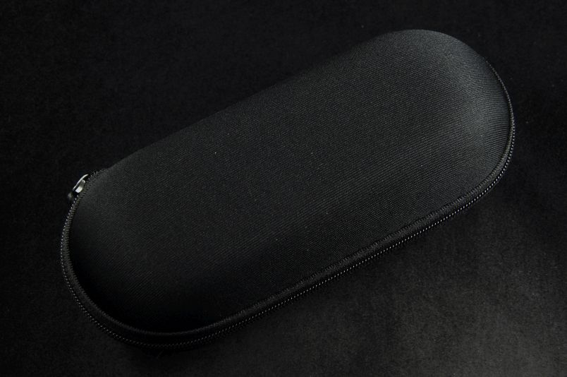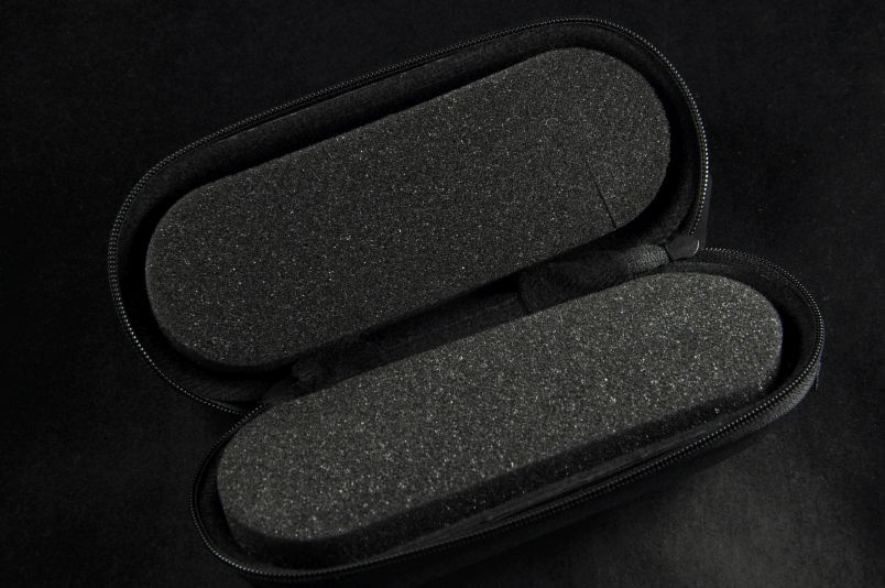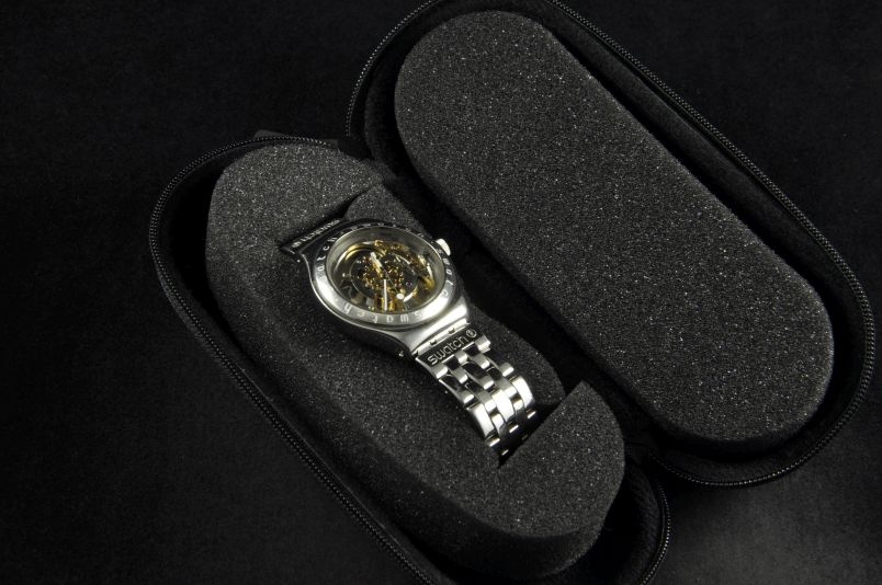Pudełko serwisowe / transportowe na zegarek. Wykonane z usztywnianej tkaniny. Futerał zamykany na suwak. Wnętrze wyściełane materiałem. Dwie gąbki z wycięciami do zamocowania zegarka.