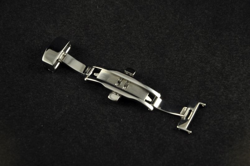 Zapięcie motylkowe do pasków. Wykonane ze stali szlachetniej 316L.Otwierane na dwie strony z pomocą przycisków. Błyszczące, w kolorze srebrnym. Pasek mocowany z jednej strony za pomocą teleskopu, z drugiej strony na bolec.